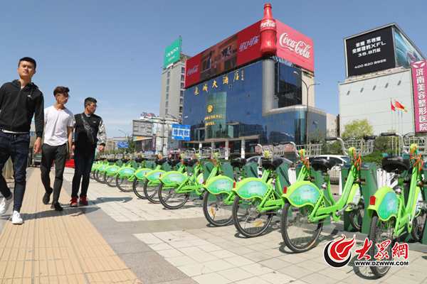 4月18日,在濟南泉城路附近,不時有騎著“小橙車”的年輕男女經過,“小綠車”的舜井街站點處卻無人問津。大眾網記者 王長坤 攝
