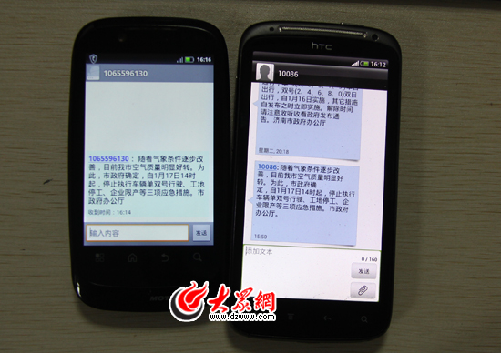 大眾網(wǎng)濟(jì)南1月17日訊(記者 王磊)今天下午16時(shí)許,濟(jì)南市民陸續(xù)收到由市政府辦公廳委托移動(dòng)和聯(lián)通等電信運(yùn)營商群發(fā)的短信提醒,從今天下午14時(shí)起,停止執(zhí)行車輛單雙號(hào)行駛、工地停工、企業(yè)限產(chǎn)等三項(xiàng)應(yīng)急措施。