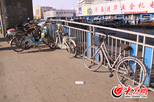 自行車橫七豎八、摩托車電動車隨處亂停,這是記者今天上午在北園路BRT公交歷山路站看到的一幕。粗略一數,原本就不寬敞的BRT站臺兩側竟然停放了20余輛自行車。記者觀察到,這些自行車兩輛“一伙”、三輛“一堆”,更有甚著直接倚靠在站臺欄桿上。原本四五米寬的站臺只留下大約2米的寬度供行人通行。