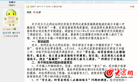6月28日,大眾網論壇菏澤網友發帖反映了巨野縣萬豐鎮二中操場變“練車場”一事(http://bbs.dzwww.com/viewthread.php?tid=25189630&extra=page%3D1),29日,大眾網記者立即對此事進行了采訪,調查發現確實有人在學校的操場練車(http://m.gaoxiaozai.com/shandong/sdnews/201106/t20110629_6440524.htm)。帖文和稿件發布后,立即得到了巨野縣教育局高度重視,6月30日,教育局立即委派副局長和監察科兩名同志對該事件涉及問題進行調查核實,7月1日下午,巨野縣教育局向本網發來《關于反映萬豐鎮二中操場變“練車場”一事的調查報告》,并繼續以“新麟州”的網名在菏澤論壇發帖,公開回應質疑。