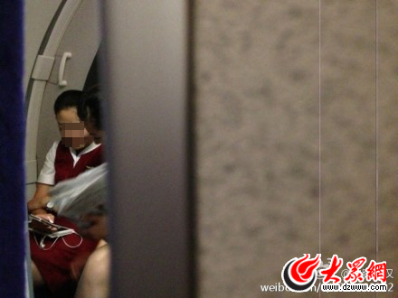 該網友發布的照片,照片中藍衣空姐用手中的報紙遮擋手機。
