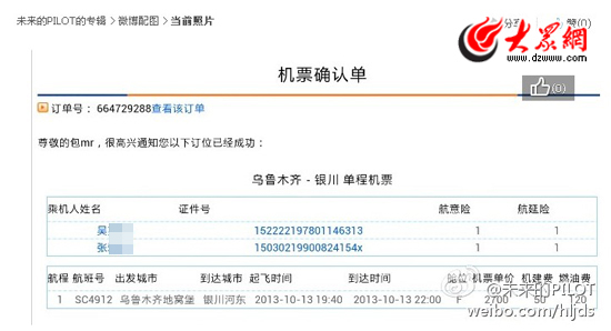 截至15日,雙方幾乎沒有任何微博“舉證”,事情似乎戛然而止。但16日晚8:27的一條微博信息,讓更多網(wǎng)友將此事與南航空姐和南航牽連在一起。一名叫做“@未來的PILOT”的微博網(wǎng)友不僅將南航空姐的生活照與“@扣腳女漢”的照片公布出來并放到一起,還上傳一張兩人在事發(fā)當(dāng)天的“機(jī)票確認(rèn)單”,確認(rèn)單上明確注明了兩人的姓名(吳某某和張某某)、證件號(hào)、訂單號(hào)、航程、航班號(hào)、出發(fā)城市、到達(dá)城市、起飛時(shí)間、到達(dá)時(shí)間等詳細(xì)信息。