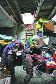住著破舊的、昏暗的、漏雨的小屋,吃著撿來的、別人送的食物,每天給母親洗腳、暖被窩,用飲料瓶子給母親制作“熱水袋”……