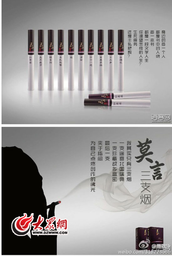 近日,一則莫言將為山東煙草品牌“泰山佛光”代言的傳言引發(fā)網(wǎng)友熱議。有網(wǎng)友爆料稱,即將推出“莫言限量版”香煙,每支煙均以《紅高粱》、《檀香刑》、《生死疲勞》等10部莫言小說命名,并采用了極為奢華的紫檀木包裝,限量銷售100套,每套售價20120元。