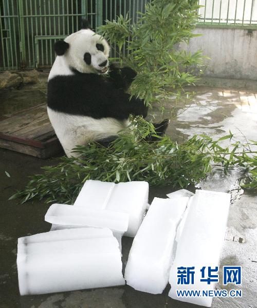 大熊貓“泉泉”在濟南動物園放有冰塊的籠舍里吃竹葉(2010年6月28日攝)。新華社發(呂傳泉 攝)