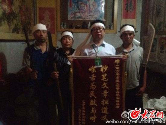 陳海濤曾是金溝子村8家拒拆戶之一,7月7日他已經和村里簽訂了“安置補償協議”并抓鬮選房,然而就在7月6日,“記錄者陳寶成”的微博上還曬出了他和另外兩名拒拆戶以及陳寶成本人的“合影”。在這張照片中,他們四個人頭系白布、手拿各種武器,并稱“決戰!……我們將與數百光頭決一死戰。請朋友們擴散,請律師們為我們做無罪辯護!”等。
