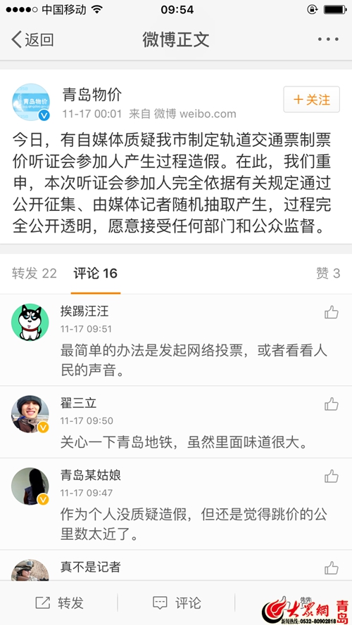 網友“我的青島”發文質疑青島地鐵票價聽證會造假。