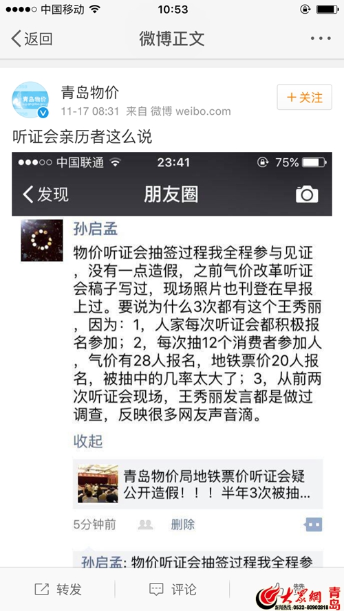 上午8點31分,@青島物價又發布了一張截圖,配文“聽證會親歷者這么說”。截圖中,一位名為孫啟孟的網友在微信朋友圈中轉發了網友的文章,并解釋“物價聽證會抽簽過程我全程參與見證,沒有一點造假……要說為什么3次都有這個王秀麗,因為:1.人家每次聽證會都積極報名參加;2.每次抽12個消費者參加,氣價(聽證會)有28人報名,地鐵票價(聽證會)20人報名,被抽中的幾率太大了;3.從前兩次聽證會現場,王秀麗發言都是做過調查,反映很多網友聲音滴。”