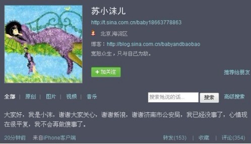 8月28日凌晨,一位名為“蘇小沫兒”的濟南女網友在微博上吐露輕生念頭,并以“最后的直播”為題發布30多條“自殺”過程文字內容。事件發生后,在愛心網友...