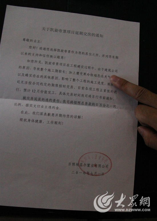 “房款都交了三年了,到現在交房還遙遙無期,我們實在等不下去了”,昨天上午,日照凱旋帝景的一位業主給本網記者打來電話,訴說了自己的買房遭遇。他告訴記者,按照購房合同,他的房子應當在2009年10月31日交房,但如今已經過了快一年了,房子還沒建完,真后悔買了這樣的“樓拖拖”。這位網名叫“夢幻凱旋”的業主告訴記者,2007年8月份他以2861元/平方米的價格與埃菲爾置業簽訂了商品房買賣合同,購買了該公司開發的凱旋帝景“金星閣”的一處住房。根據合同約定,開發商于2009年10月底向其交房。時至今日,離合同約定交房日期已經過去了將近一年的時間,金星閣仍在建設中。... ...