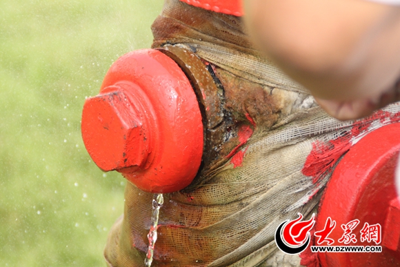 在菏澤德潤化工有限公司,檢查組要求工作人員現場進行消防演練,其中一個消防栓老化開裂,無法噴水。