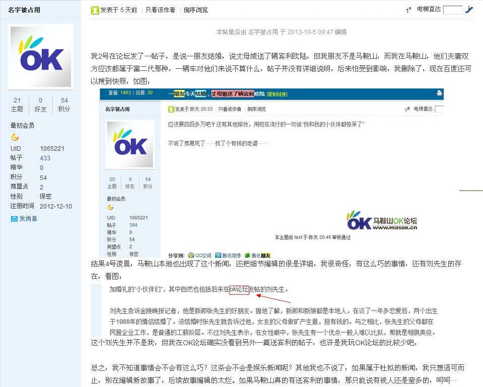 按照傅中平的提示,大眾網(wǎng)記者也登錄了“馬鞍山OK論壇”,看到了這篇發(fā)于10月5日,題為《不會(huì)這么巧吧?我朋友結(jié)婚送了賓利,馬鞍山這邊也送了賓利?》的質(zhì)疑帖子。這位名叫“名字被占用”的網(wǎng)友在帖子中說: