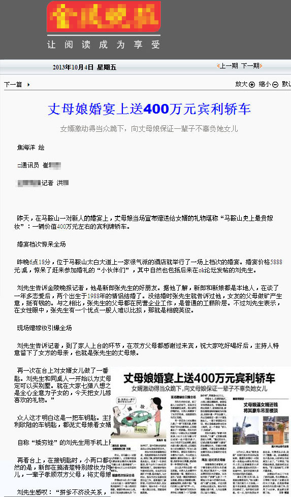 10月4日南京某報(bào)的《丈母娘婚宴上送400萬元賓利轎車》報(bào)道