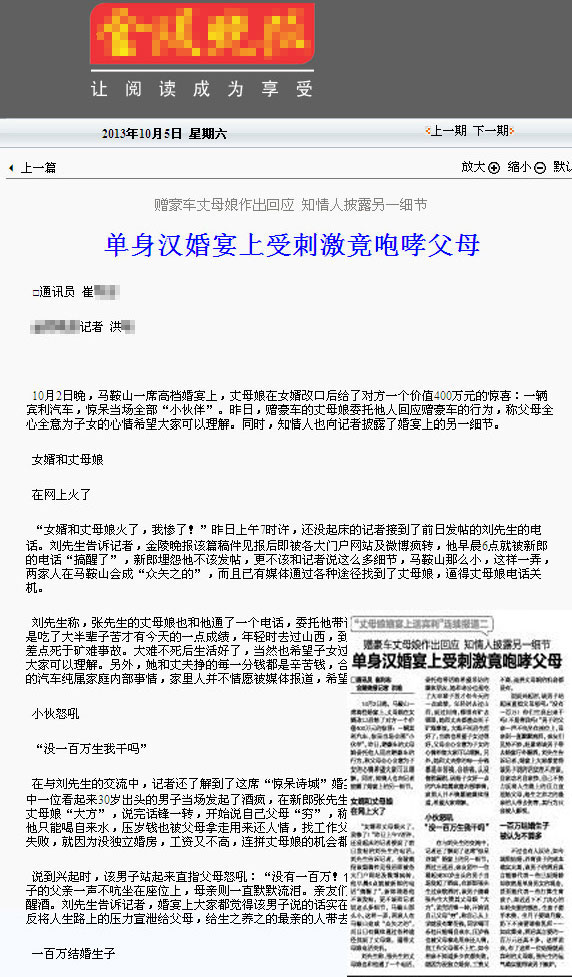 傅中平接著仔細(xì)翻看了10月4日、5日的南京某報(bào),這時(shí),他發(fā)現(xiàn)了“通訊員 崔某某 記者 洪某”在10月5日又發(fā)了一篇后續(xù)報(bào)道,堪稱“土豪丈母娘”報(bào)道的“第二季”。該報(bào)道稱:他一早接到爆料人電話,稱婚禮上的丈母娘委托他帶話給希望采訪的媒體朋友,不希望再被媒體報(bào)道,爆料人還爆出另一個(gè)細(xì)節(jié)--一個(gè)單身漢婚宴上受刺激竟咆哮父母。