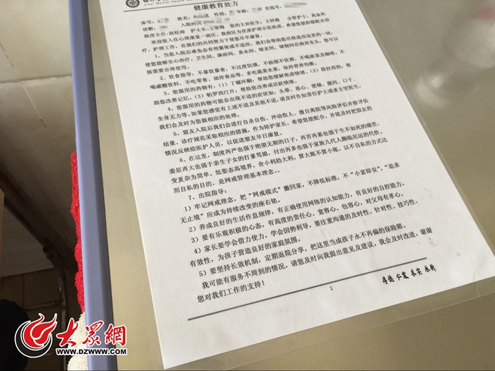 網戒中心所在的二樓,與一般醫院的住院部無異,明亮整潔,墻上貼著科普展板和中心活動的照片。走廊兩頭,有廁所、浴室等設施和魚缸、綠植等陳設。走廊兩側的病房里,生活用品的整理可以達到軍事化標準。病床上的白色床單鋪得平平整整,一絲褶皺也沒有,白色的被子疊成豆腐塊放在床頭。水桶、小凳統一放在床下。毛巾統一掛在床頭柜一側的粘鉤上。床頭柜上幾乎沒有雜物,只有統一放在右上角的水杯和一張塑封的“健康教育處方”,上面寫著床號、姓名、年齡等個人信息和飲食指導、服用的藥物、可能出現的不適癥狀和注意事項等。