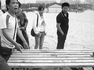 煙臺開發(fā)區(qū)4A級景區(qū)——金沙灘海水浴場,幾塊木頭板子搭起了板凳,居然明碼標(biāo)價“100元/小時”。