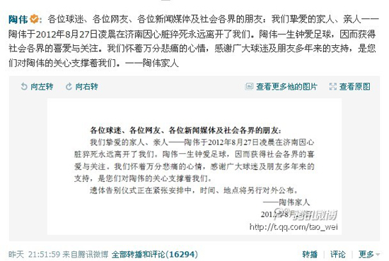 陶偉家人在其微博中說,“各位球迷、各位網(wǎng)友、各位新聞媒體及社會各界的朋友:我們摯愛的家人、親人——陶偉于2012年8月27日凌晨在濟南因心臟猝死永遠(yuǎn)離開了我們。陶偉一生鐘愛足球,因而獲得社會各界的喜愛與關(guān)注。我們懷著萬分悲痛的心情,感謝廣大球迷及朋友多年來的支持,是您們對陶偉的關(guān)心支撐著我們!