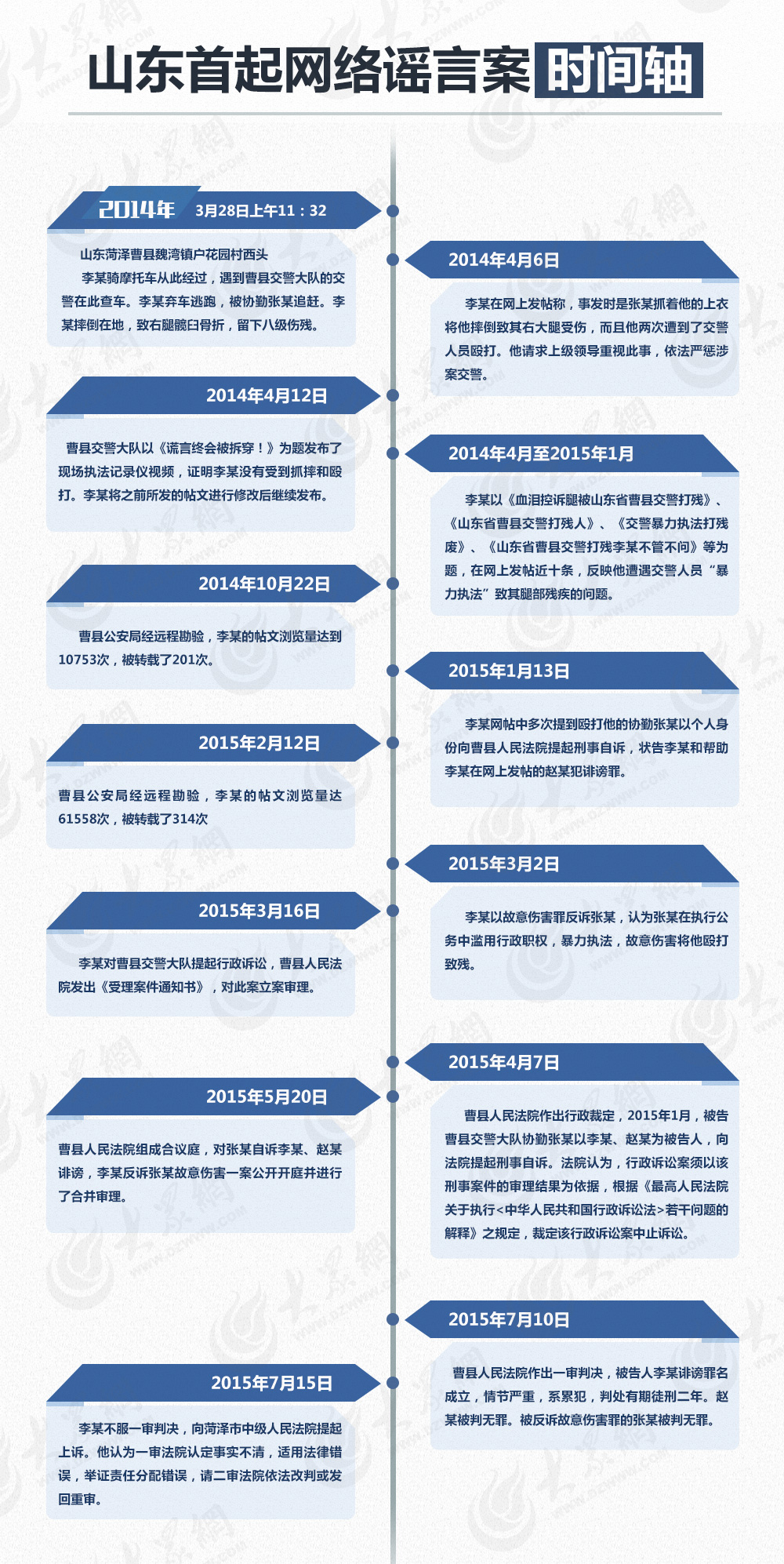 這是一起緣起交警執法的刑事自訴案件。 2014年3月28日,山東省菏澤市曹縣的李某駕駛摩托車時,路遇交警查車,棄車而逃摔倒致右髖臼骨折,八級傷殘。 自2014年4月起,李某不斷在網上發帖控訴曹縣交警大隊“暴力執法”。 2015年1月13日,李某網帖所述的打人者協勤張某,以個人身份向曹縣人民法院提起刑事自訴,以誹謗罪狀告李某和幫助李某在網上發帖的趙某。 2015年3月2日,李某以故意傷害罪反訴張某。2015年5月20日,曹縣人民法院組成合議庭,將兩案合并公開審理。2015年7月10日,山東菏澤曹縣人民法院一審宣判,以誹謗罪判處被告人李某有期徒刑二年。 2015年7月15日,李某不服判決提起上訴。這起尚未終審判決的案件,被媒體稱為“山東網絡謠言第一案”。