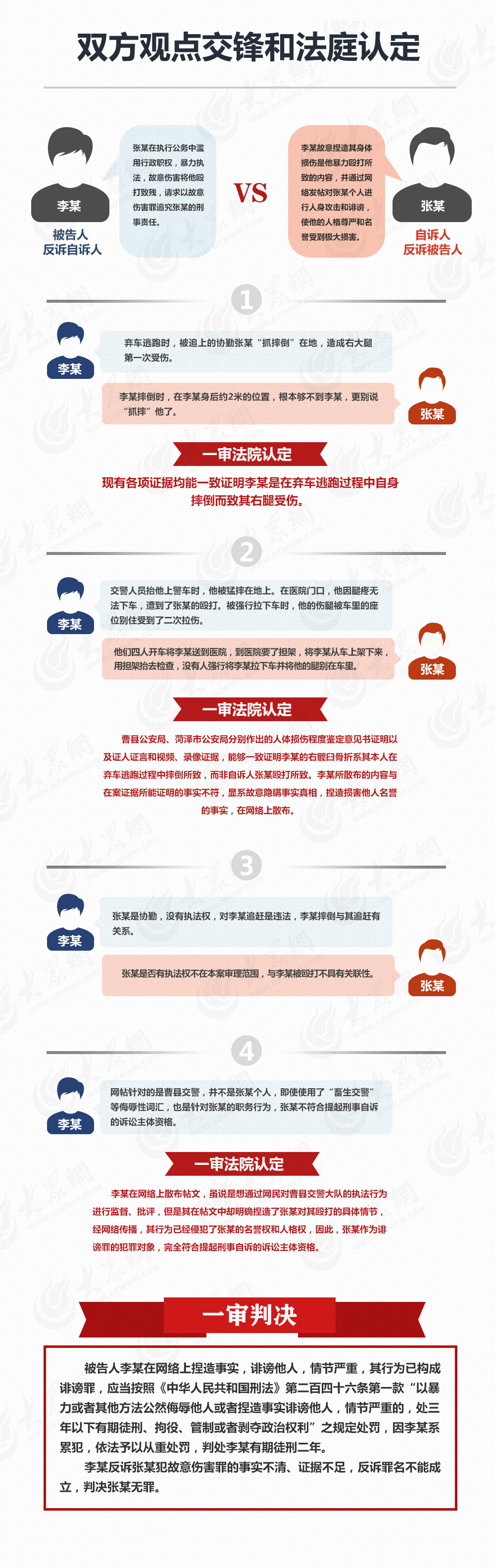 2015年1月13日,李某網帖中多次提到毆打他的協勤張某以個人身份向曹縣人民法院提起刑事自訴,以誹謗罪狀告李某和幫助李某在網上發帖的趙某。