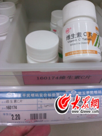 大眾網記者走訪了漱玉平民大藥店、平嘉大藥房等藥店發現,最便宜的維生素片,是由東北制藥集團沈陽第一制藥有限公司生產的。維生素C片是1.2元/瓶,維生素D是1.4元/瓶,規格都是每瓶100片,每片的維生素含量是100毫克。還有一種比較便宜的,是山東新華制藥生產的維生素C片,售價是2.2元一瓶,規格同樣是100片裝,每片含維生素C100毫克。這兩種都是白色的小藥瓶,口服。