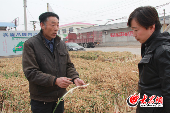 章丘棗園街道萬新富硒大蔥農(nóng)業(yè)合作社負(fù)責(zé)人王恒亮,向記者介紹章丘大蔥的價(jià)格情況。