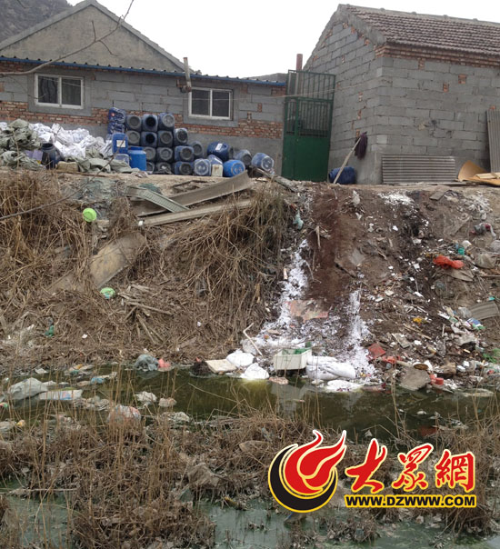 大眾網(wǎng)記者細(xì)數(shù)了一下,沿岸不到兩百米的范圍內(nèi),石材加工作坊就超過5家,而且每一家都設(shè)置了多個(gè)排污口,污水直接排入華山大溝。有的作坊竟把染料桶堆放在院子外面,堆得跟小山似的。在排污口附近的水域,堆積了大量白色沉淀物,附近的土壤上有一層厚厚的粉末,上面除了干枯的樹木,很少有植物生長。