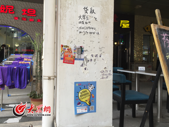 4月11日,大眾網(wǎng)記者來(lái)到濟(jì)南長(zhǎng)清大學(xué)城商業(yè)街,在部分路段,幾乎每走十幾米就能到校園貸款的廣告。這些廣告有的是制作精良的海報(bào),有的是手寫(xiě)的“牛皮癬”,即使在商場(chǎng)的公廁里,坑位前的隔板上也或手寫(xiě)、或噴繪地分布著貸款廣告。這些廣告留下的多是微信、QQ號(hào)碼等聯(lián)系方式,很多只是一個(gè)二維碼,只要“掃一掃”就能借款。