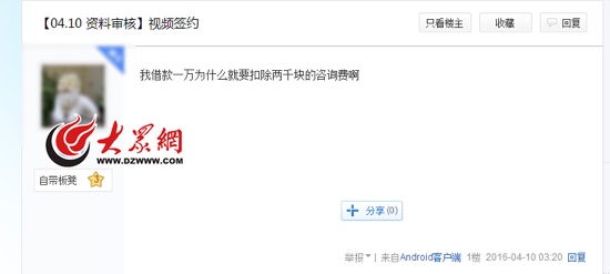 一名大學(xué)生在某網(wǎng)貸平臺(tái)官方貼吧發(fā)帖稱借款10000元要扣2000元咨詢費(fèi)。