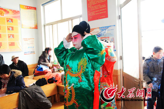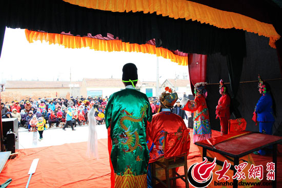 大眾網濱州2月5日訊(記者 賈礦中)2014年2月5日,在山東博興縣店子鎮劉耿村,土生土長的農民演員正在為農民群眾表演呂劇《回龍觀》。