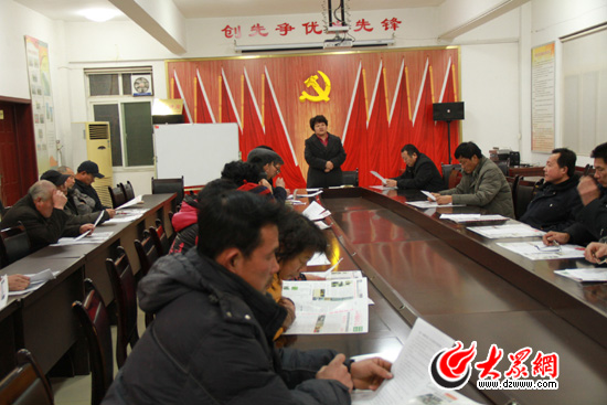 章丘市雙山街道辦三澗溪社區(qū)黨支部書記高淑貞帶領村民讀社區(qū)報。