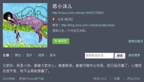 蘇小沫兒:各位脖友們,小沫兒身體已經恢復,情緒也正常。謝謝大家多方努力。希望大家原諒小沫兒的一時沖動給各方帶來的麻煩。我保證以后珍惜擁有的一切,做個積極樂觀的人。再次致謝。