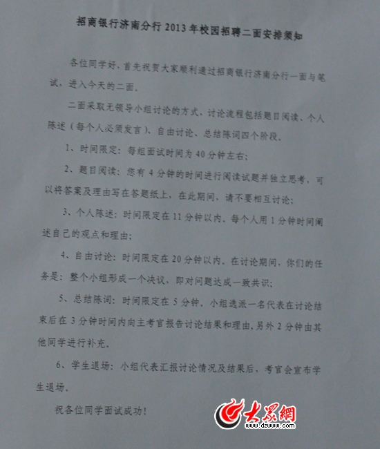 大眾網(wǎng)濟(jì)南12月15日訊(記者 王磊 吳毅斐)12月13日,在招行濟(jì)南招聘驚現(xiàn)“拼爹門”引發(fā)網(wǎng)友熱議后,15日,招商銀行濟(jì)南分行2013年校園招聘面試在濟(jì)南如期舉行。現(xiàn)場兩位主考官均來自總行人力資源部,新華社、人民網(wǎng)、齊魯晚報(bào)、大眾網(wǎng)等中央和省級媒體的記者受邀旁聽了面試過程。“二面”采用無領(lǐng)導(dǎo)小組討論方式,當(dāng)場宣布進(jìn)入“三面”的結(jié)果。大眾網(wǎng)記者隨機(jī)采訪了部分“二面”落選者,他們對整個招聘的客觀和透明度表示認(rèn)可。