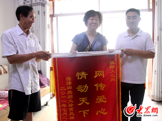 賈鳳祥把印有“網傳愛心 情動天下”的錦旗送到大眾網總編助理、采訪中心主任李冉手中。