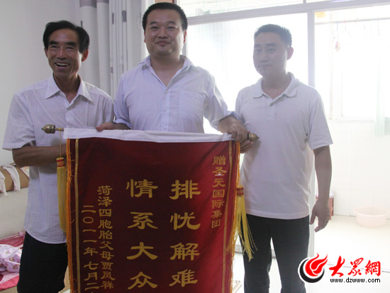 賈鳳祥把印有“排憂解難 情系大眾”的錦旗送到圣元國際集團菏澤城市經理張虎子手中。