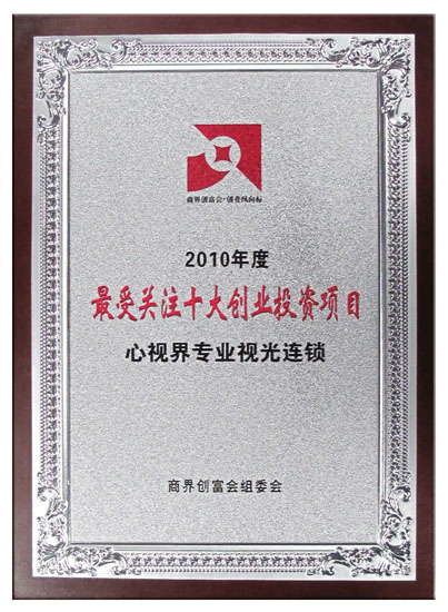 由商界傳媒主辦,中國最具公信力的互動招商加盟平臺——商界財視網與中國品牌研究中心協辦的2010商界創富會——創業風向標活動,經過260萬創業者歷經90天的網絡投票和專家的綜合評定,來自山東唯一品牌濟南“心視界”及全國其它9個優質項目脫穎而出,不僅入圍50強,還贏得此次活動最高榮譽 —— 2010年最受關注十大創業投資項目。