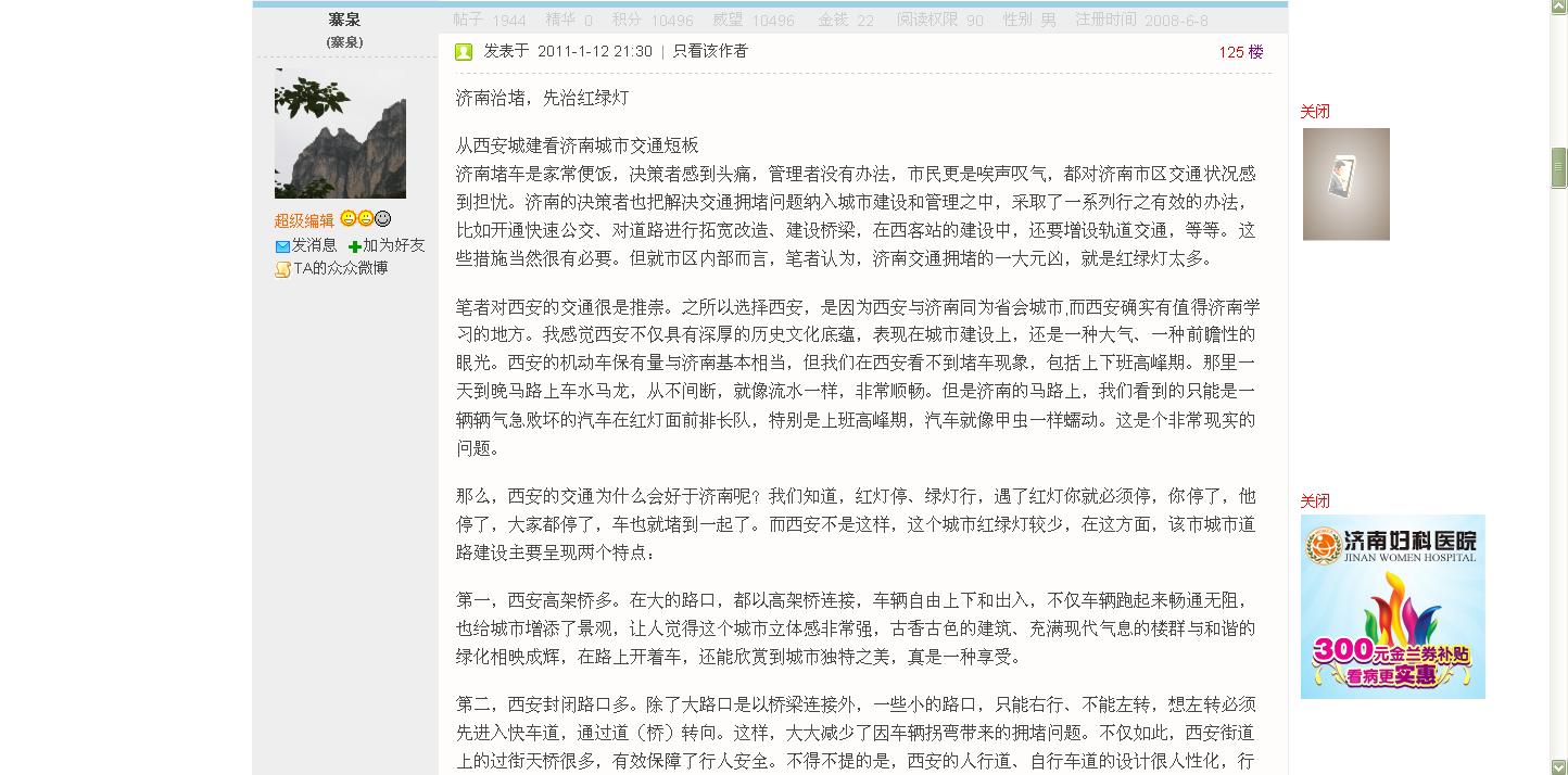 “西安的交通為什么會好于濟南呢?我們知道,紅燈停、綠燈行,遇了紅燈你就必須停,你停了,他停了,大家都停了,車也就堵到一起了。”在網友“寨泉”看來,濟南的決策者雖然也把解決交通擁堵問題納入城市建設和管理之中,采取了一系列行之有效的辦法,比如開通快速公交、對道路進行拓寬改造、建設橋梁以及在西客站的建設中增設軌道交通等等。這些措施當然很有必要,但就市區內部而言,濟南交通擁堵的一大元兇,就是紅綠燈太多。