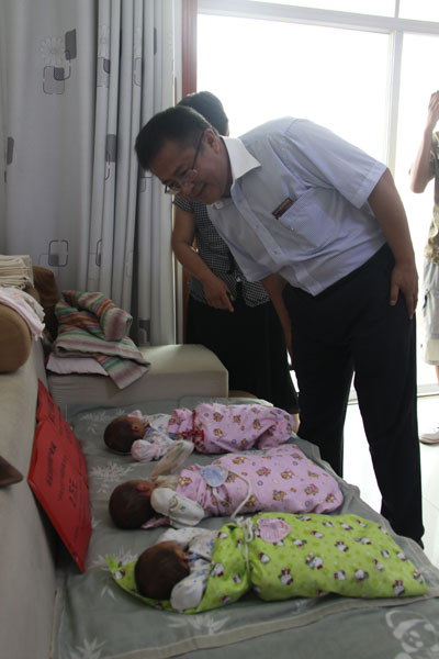 劉總一行,此次為李雪和賈鳳祥夫婦帶去趙步長教授、趙濤董事長、趙超總裁步長大家庭“步長寶寶”四胞胎慰問金4萬元,山東步長五公司慰問金2萬元。李雪和賈鳳祥所在公司以文件的形式決定從2011年7月份起每人每月增加1000元,累計14.4萬元,作為生活補貼,直到孩子6周歲,以資助“步長寶寶”四胞胎健康成長。這些遠沒有結束,來自山東步長各公司、步長總部機關、步長醫(yī)院、商貿學院等分支機構的愛心問候才剛剛開始,愛心傳遞的火炬在步長熊熊燃起,生生不息……