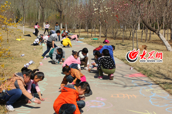 孩子們?cè)谥参飯@的道路上用粉筆作畫(huà)