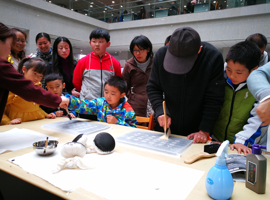 21日上午,青島市圖書館在二樓大廳為市民們舉辦了“傳拓技藝體驗”及“縫制一本線裝書”活動。市圖書館的專業古籍人員帶大家將宣紙覆在石刻上面,然后用刷子慢慢拓出清晰的文字,親身體驗了傳拓技藝的神奇魅力。
