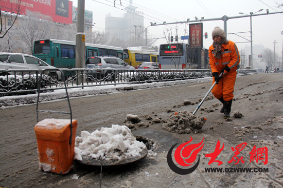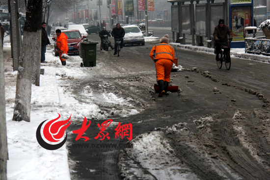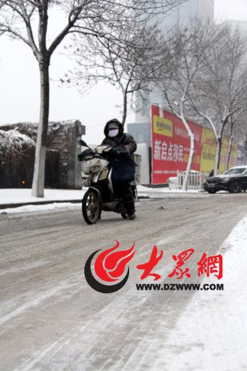 雖然早上5點起,城管部門就已經開始撒融雪劑,但大眾網記者在現場看到,車流量較少的副道以及人行道依然被冰雪覆蓋,騎電動車和自行車出行的市民幾乎全部垂著雙腳掌握平衡,控制車速。“現在確實有點滑,等會有灑鹽水的車來給積雪灑水,灑完鹽水后就會好多了!”在濼源大街清掃積雪的環衛工說。