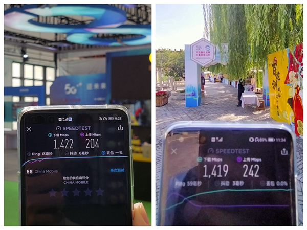 山東移動,5G現場實時速率,下行速率均能達到1.4 Gbit/s以上,上行速率均能達到200Mbit/s以上。