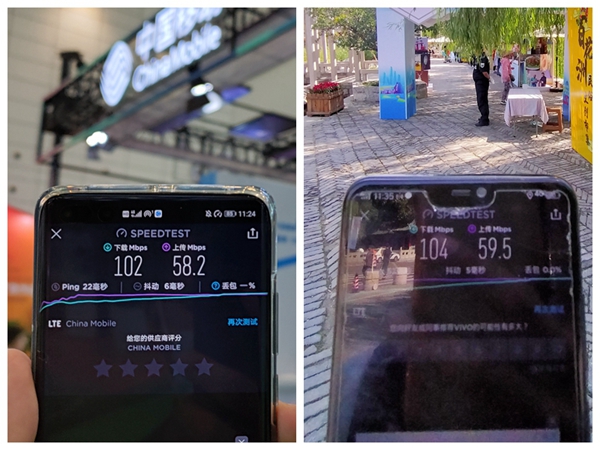 山東移動,4G現場實時速率,下行速率均能達到102 Mbit/s以上,上行速率均能達到58 Mbit/s以上。