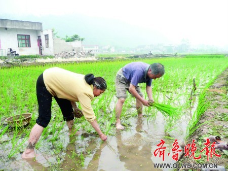 “雖然屋子塌了,但這里終歸是我們的家。”朱老漢的老伴說。老兩口目前還種著三畝多地,收完麥子和油菜后本該馬上插水稻,一場地震耽誤了不少時間。現(xiàn)在地里的秧苗開始瘋長了,老兩口顧不上地震帶來的傷痛,又開始了年復(fù)一年的勞作。
