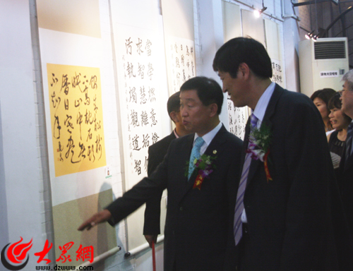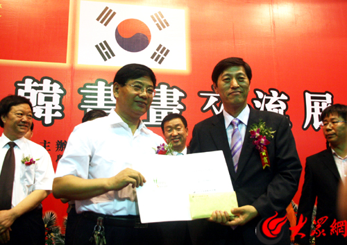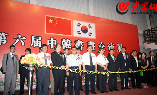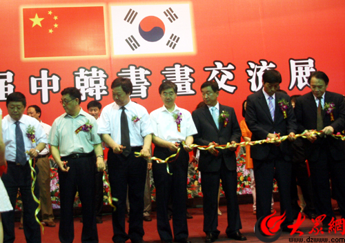 大眾網(wǎng)濟(jì)南6月22日訊(記者 趙永剛)今天上午,第六屆中韓書畫交流展在濟(jì)南東方現(xiàn)代藝術(shù)館開(kāi)幕。省委宣傳部副部長(zhǎng)、省文博會(huì)組委會(huì)副主任徐向紅,濟(jì)南市副市長(zhǎng)張宗祥,濟(jì)南市政協(xié)副主席王可敏,濟(jì)南市原政協(xié)副主席、濟(jì)南市文聯(lián)主席吳澤浩和韓國(guó)水原市文化福祉委員會(huì)委員長(zhǎng)金鐘基、韓國(guó)水原市書法協(xié)會(huì)會(huì)長(zhǎng)盧福煥一行及社會(huì)各界人士200多人出席了開(kāi)幕式。開(kāi)幕式上,韓國(guó)水原書法協(xié)會(huì)向中國(guó)地震災(zāi)區(qū)捐款1萬(wàn)元人民幣。
