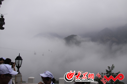 22日下午5點半,雨后泰山突現云山奇觀,泰山之巔遠遠望去,黑壓壓的云層像大山一般氣勢,而索道上的纜車更像穿梭于大山之中。