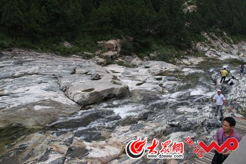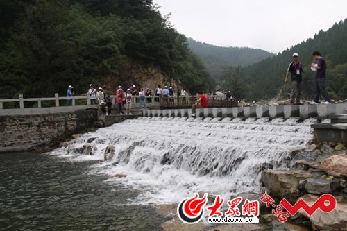 22日下午,網(wǎng)絡(luò)媒體山東行一行近百人抵達泰安市,在這里參觀采訪的首站就是桃花峪景區(qū)的彩石溪。