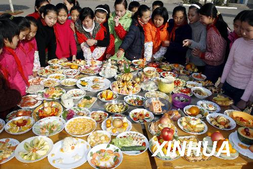 資料圖片:2008年12月17日,河南省許昌市毓秀路小學的學生觀看同學們制作的蔬菜水果拼盤作品。 為鍛煉學生的動手、動腦和創新思維能力,倡導大家多食蔬菜水果,許昌市毓秀路小學開展“我的創意我做主”蔬菜水果拼盤設計活動。學生們積極參與,自己動手制作各種蔬菜水果拼盤,如同一桌桌“滿漢全席”。新華社發(黃增瑞 攝)