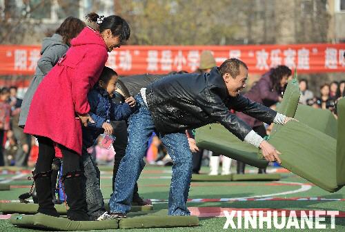資料圖片:2008年11月21日,學生和家長們在進行“鋪石過河”比賽。當日,寧夏銀川市景岳小學舉行第一屆“歡樂家庭”親子互動趣味運動會。“鋪石過河”、“全家搬搬樂”、“親子二人行”等趣味比賽項目讓家長和孩子共同體驗運動帶來的樂趣。 新華社記者王鵬攝