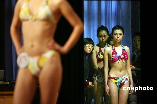 2月8日,在山東工藝美術學院服裝表演系的形體專業測試中,209名考生身穿泳裝在T臺上展示形體美,秀出才藝,同臺競爭40個入學名額。中新社發 王鋒鋒 攝  >>>更多圖片