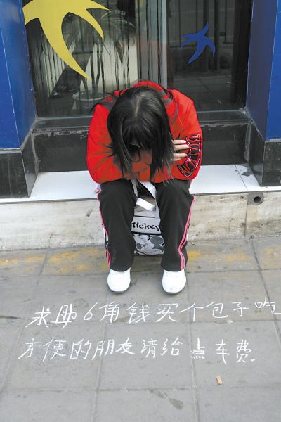 “我叫王欣(音)”乞討的90后小聲地告訴記者她今年12歲。記者拿出一元錢給她,提出陪她去買包子,可王欣并不愿意走。一個路過的大爺告訴記者,這個小女孩每天都在換地方。就在這時,王欣收起紙板匆匆離開。2月10日,記者意外在大黃路口發(fā)現(xiàn)王欣,這次她用粉筆在地上寫的是“乞討6角錢買個包子吃,如果方便再給點車費”。